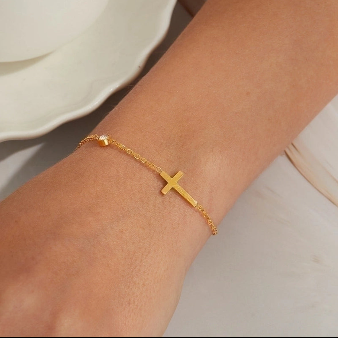 Dezentes Armband mit Kreuz Symbol und einem Eyecatcher mit Strass besetzt.
